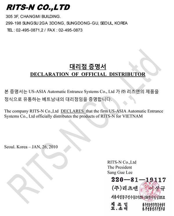 - Chỉ có MYACO là công ty Đại diện độc quyền phân phối Cửa tự động Rits-n Hàn Quốc tại Việt Nam mà thôi.